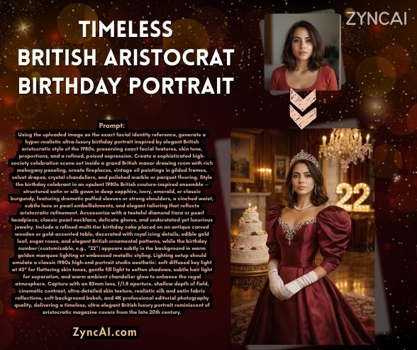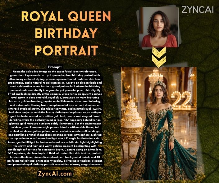 Transform your photo into a majestic royal queen-inspired birthday portrait set inside a grand European palace hall. This prompt creates an ultra-luxury scene with an opulent couture gown, sparkling crown, glowing marquee numbers, and a lavish multi-tier cake. Cinematic warm lighting, crystal chandeliers, and rich golden details elevate the atmosphere with timeless elegance. The result is a powerful, magazine-quality royal birthday portrait that feels regal, sophisticated, and unforgettable. 👑✨
